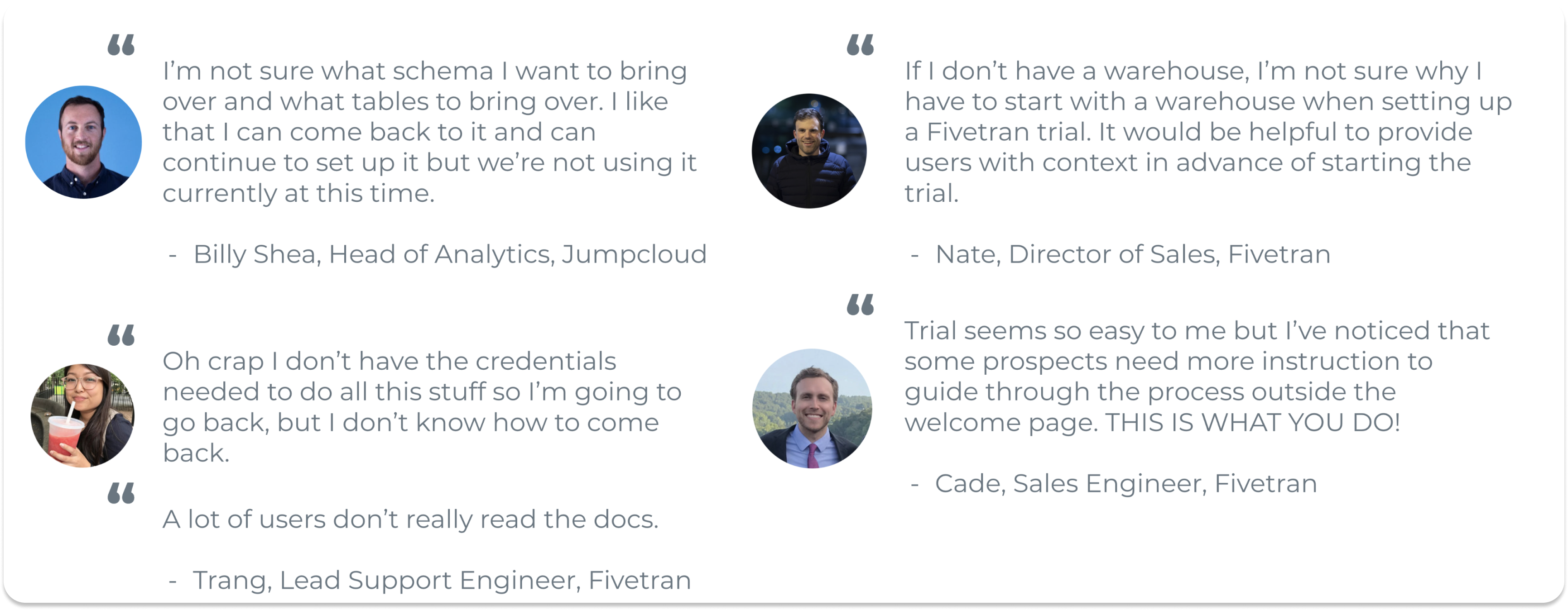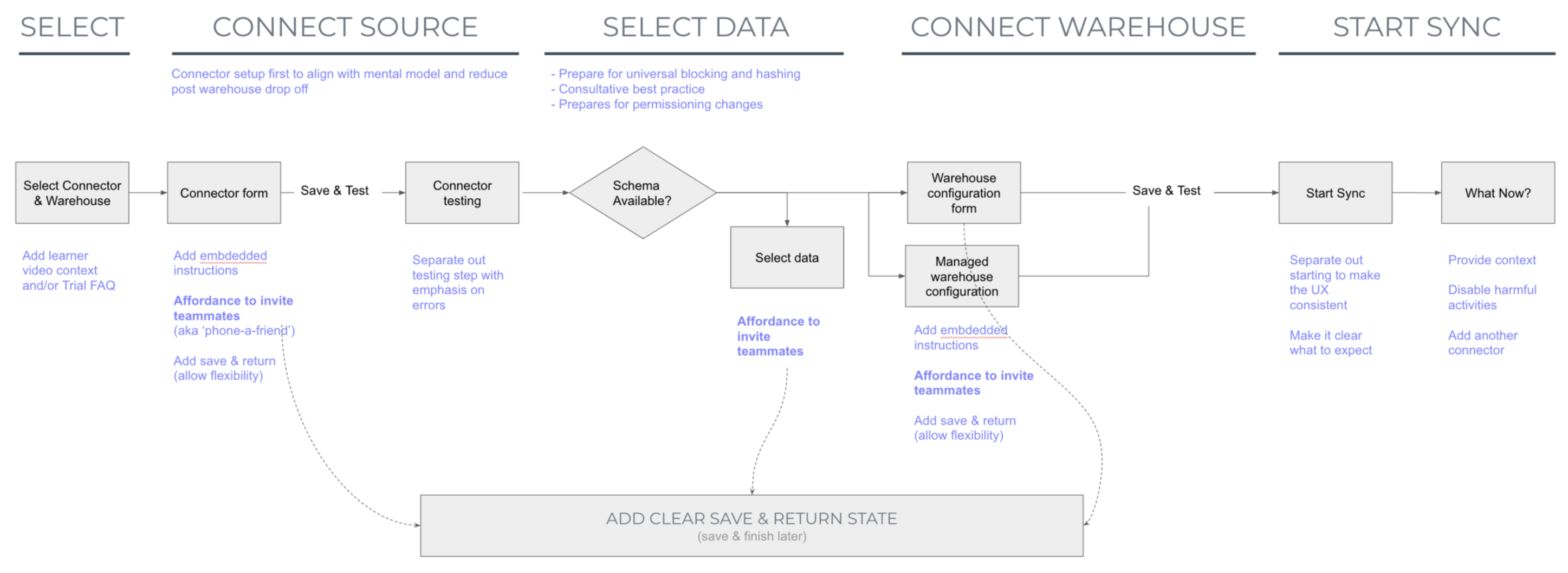 Continuing from research, we identified pain points across the entire user journey, but could not address it all at once. In order to enable self-service usage, we had to increase user confidence in completing setup tasks to start with.
